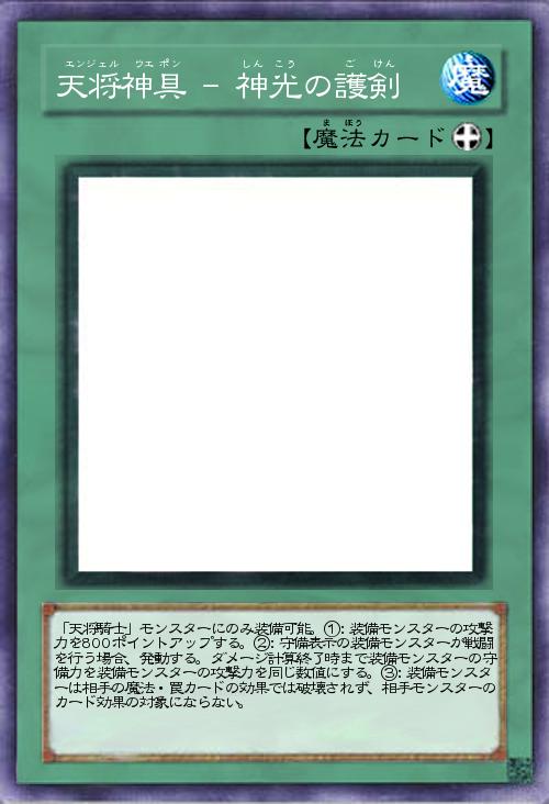 | 「天将騎士」モンスターにのみ装備可能。①:装備モンスターの攻撃力を800ポイントアップする。②:守備表示の装備モンスターが戦闘を行う場合、発動する。ダメージ計算終了時まで装備モンスターの守備力を装備モンスターの攻撃力を同じ数値にする。③:装備モンスターは相手の魔法・罠カードの効果では破壊されず、相手モンスターのカード効果の対象にならない。 | |||