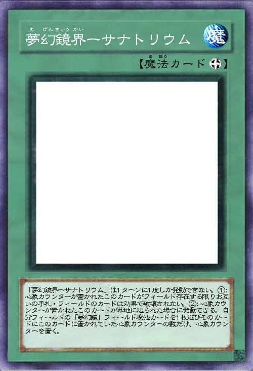 | 「夢幻鏡界ーサナトリウム」は1ターンに1度しか発動できない。①:心象カウンターが置かれたこのカードがフィールド存在する限りお互いの手札・フィールドのカードは効果で破壊されない。②:心象カウンターが置かれたこのカードが墓地に送られた場合に発動できる。自分フィールドの「夢幻鏡」フィールド魔法カードを1枚選びそのカードにこのカードに置かれていた心象カウンターの数だけ、心象カウンターを置く。 | |||