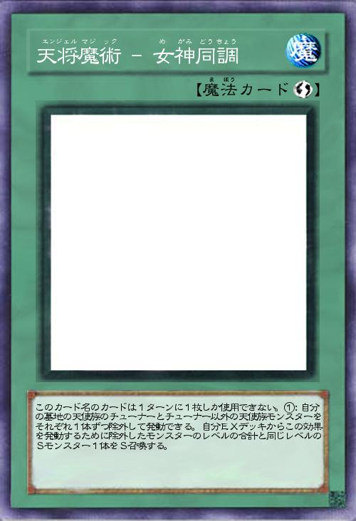 | このカード名のカードは1ターンに1枚しか使用できない。①:自分の墓地の天使族のチューナーとチューナー以外の天使族モンスターをそれぞれ1体ずつ除外して発動できる。自分EXデッキからこの効果を発動するために除外したモンスターのレベルの合計と同じレベルのSモンスター1体をS召喚する。 | |||