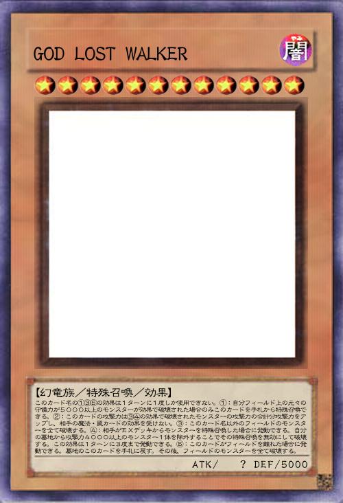 | このカード名の①③⑤の効果は1ターンに1度しか使用できない。①:自分フィールド上の元々の守備力が5000以上のモンスターが効果で破壊された場合のみこのカードを手札から特殊召喚できる。②:このカードの攻撃力は③④の効果で破壊されたモンスターの攻撃力の合計分攻撃力をアップし、相手の魔法・罠カードの効果を受けない。③:このカード名以外のフィールドのモンスターを全て破壊する。④:相手がEXデッキからモンスターを特殊召喚した場合に発動できる。自分の墓地から攻撃力4000以上のモンスター1体を除外することでその特殊召喚を無効にして破壊する。この効果は1ターンに3度まで発動できる。⑤:このカードがフィールドを離れた場合に発動できる。墓地のこのカードを手札に戻す。その後、フィールドのモンスターを全て破壊する。 | |||