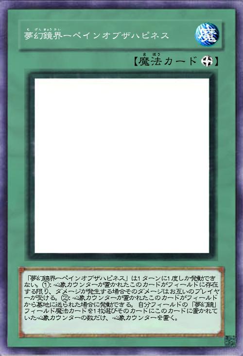 | 「夢幻鏡界ーペインオブザハピネス」は1ターンに1度しか発動できない。①:心象カウンターが置かれたこのカードがフィールドに存在する限り、ダメージが発生する場合そのダメージはお互いのプレイヤーが受ける。②:心象カウンターが置かれたこのカードがフィールドから墓地に送られた場合に発動できる。自分フィールドの「夢幻鏡」フィールド魔法カードを1枚選びそのカードにこのカードに置かれていた心象カウンターの数だけ、心象カウンターを置く。 | |||