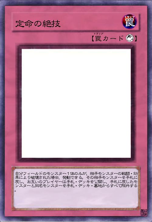 | 自分フィールドのモンスター1体のみが、相手モンスターの戦闘・効果により破壊された場合、発動できる。その相手モンスターを手札に戻し、お互いのプレイヤーは手札・デッキを公開し、手札に戻したモンスターと同名モンスターを手札・デッキ・墓地からすべて除外する。 | |||