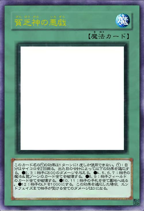 | このカード名の①の効果は1ターンに1度しか使用できない。①:自分はサイコロを2回振る。出た目の合計によって以下の効果を適応する。●2.3:相手に500のダメージを与える。●4.5.6.7:相手の魔法&罠ゾーンのカード全てを破壊する。●8.9:相手フィールドのカード全てを破壊する。●10.11:相手の手札を全て墓地へ送る。●12:相手のLPを1000にする。この効果を適応した場合、エンドフェイズまで相手が受ける全てのダメージは0になる。 | |||