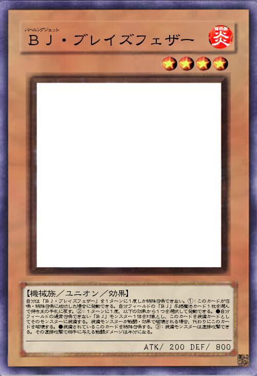 | 自分は「BJ・ブレイズフェザー」を1ターンに1度しか特殊召喚できない。①:このカードが召喚・特殊召喚に成功した場合に発動できる。自分フィールドの「BJ」永続魔法カード1枚を選んで持ち主の手札に戻す。②:1ターンに1度、以下の効果から1つを選択して発動できる。●自分フィールドの通常召喚できない「BJ」モンスター1体を対象とし、このカードを装備カードとしてそのモンスターに装備する。装備モンスターが戦闘・効果で破壊される場合、代わりにこのカードを破壊する。●装備されているこのカードを特殊召喚する。③:装備モンスターは直接攻撃できる。その直接攻撃で相手に与える戦闘ダメージは半分になる。 | |||