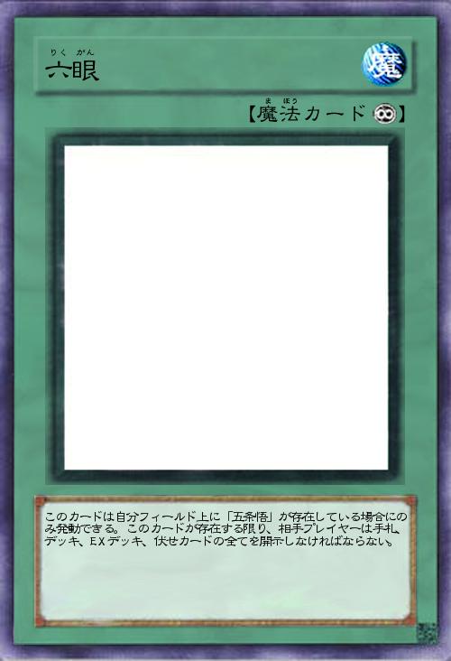 | このカードは自分フィールド上に「五条悟」が存在している場合にのみ発動できる。このカードが存在する限り、相手プレイヤーは手札、デッキ、EXデッキ、伏せカードの全てを開示しなければならない。 | |||