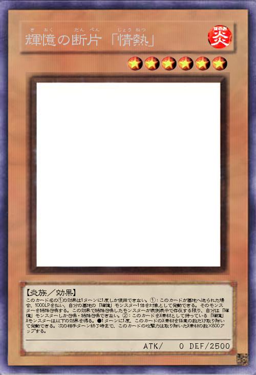 | このカード名の①の効果は1ターンに1度しか使用できない。①:このカードが墓地へ送られた場合、1000LPを払い、自分の墓地の「輝憶」モンスター1体を対象として発動できる。そのモンスターを特殊召喚する。この効果で特殊召喚したモンスターが表側表示で存在する限り、自分は「輝憶」モンスターしか召喚・特殊召喚できない。②:このカードをX素材として持っている「輝憶」Xモンスターは以下の効果を得る。●1ターンに1度、このカードのX素材を任意の数だけ取り除いて発動できる。次の相手ターン終了時まで、このカードの攻撃力は取り除いたX素材の数×800アップする。 | |||