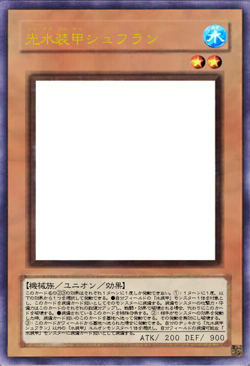 | このカード名の②③の効果はそれぞれ1ターンに1度しか発動できない。①:1ターンに1度、以下の効果から1つを選択して発動できる。●自分フィールドの「水装甲」モンスター1体を対象とし、このカードを装備カード扱いとしてそのモンスターに装備する。装備モンスターの攻撃力・守備力はこのカードのそれぞれの数値分アップし、戦闘・効果で破壊される場合、代わりにこのカードを破壊する。●装備されているこのカードを特殊召喚する。②:相手がモンスターの効果を発動した時、装備カード扱いのこのカードを墓地へ送って発動できる。その発動を無効にし破壊する。③:このカードがフィールドから墓地へ送られた場合に発動できる。自分のデッキから「光水装甲シュフラン」以外の「水装甲」ユニオンモンスター1体を選択し、自分フィールドの装備可能な「水装甲」モンスターに装備カード扱いとして装備する。 | |||