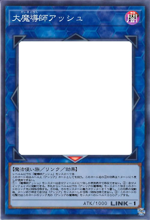 | レベル4以下の「魔導師アッシュ」モンスター1体 このカード名はルール上「アシリア」カードとしても扱う。このカード名の②の効果は1ターンに1度しか使用できない。 ①:「魔導師アッシュ」モンスターは自分フィールドに1体しか表側表示で存在できない。②:自分メインフェイズに発動できる。手札からレベル4以下の「アシリアの魔導機」モンスター1体をこのカードのリンク先に特殊召喚する。その後、そのモンスターに魔力カウンターを1つ置く。この効果の発動後、ターン終了時まで自分は「アシリア」モンスターしか召喚・特殊召喚できない。③:このカードの攻撃力はこのカードのリンク先の「アシリアの魔導機」モンスターのレベル×200アップする。 | |||