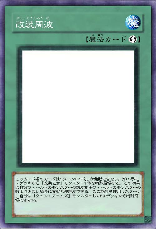 | このカード名のカードは1ターンに1枚しか発動できない。①:手札・デッキから「改装乙女」モンスター1体を特殊召喚する。この効果は自分フィールドのモンスターの数が相手フィールドのモンスターの数より少ない場合に発動と処理ができる。この効果を使用したターン、自分は「クイン・アームズ」モンスターしかEXデッキから特殊召喚できない。 | |||