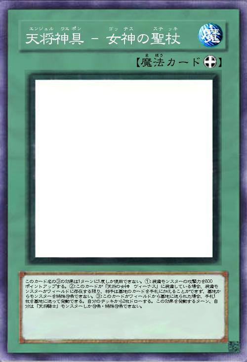 | このカード名の③の効果は1ターンに1度しか使用できない。①:装備モンスターの攻撃力を800ポイントアップする。②:このカードが「天将の女神 ヴィーナス」に装備している場合、装備モンスターがフィールドに存在する限り、相手は墓地のカードを手札に加えることができず、墓地からモンスターを特殊召喚できない。③:このカードがフィールドから墓地に送られた場合、手札1枚を墓地に送って発動できる。自分のデッキから2枚ドローする。この効果を発動するターン、自分は「天将騎士」モンスターしか召喚・特殊召喚できない。 | |||