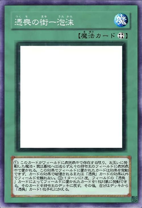 | ①:このカードがフィールドに表側表示で存在する限り、お互いに発動した魔法・罠は墓地へは送らず元々の持ち主のフィールドに表側表示で置かれる。この効果でフィールドに置かれたカードは効果を発動できず、カードの効果で破壊されるまたは「憑喪」カードの効果以外でフィールドを離れない。②:1ターンに1度、フィールドの「憑喪」カードによってフィールドに置かれたカードを1枚対象に発動できる。そのカードを持ち主のデッキに戻す。その後、自分はデッキから「憑喪」カード1枚手札に加える。 | |||