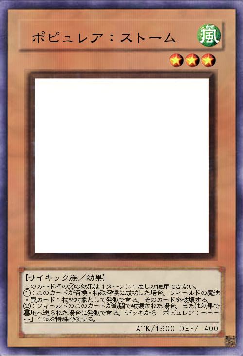 | このカード名の②の効果は1ターンに1度しか使用できない。 ①:このカードが召喚・特殊召喚に成功した場合、フィールドの魔法・罠カード1枚を対象として発動できる。そのカードを破壊する。 ②:フィールドのこのカードが戦闘で破壊された場合、または効果で墓地へ送られた場合に発動できる。デッキから「ポピュレア:ーーーー」1体を特殊召喚する。 | |||