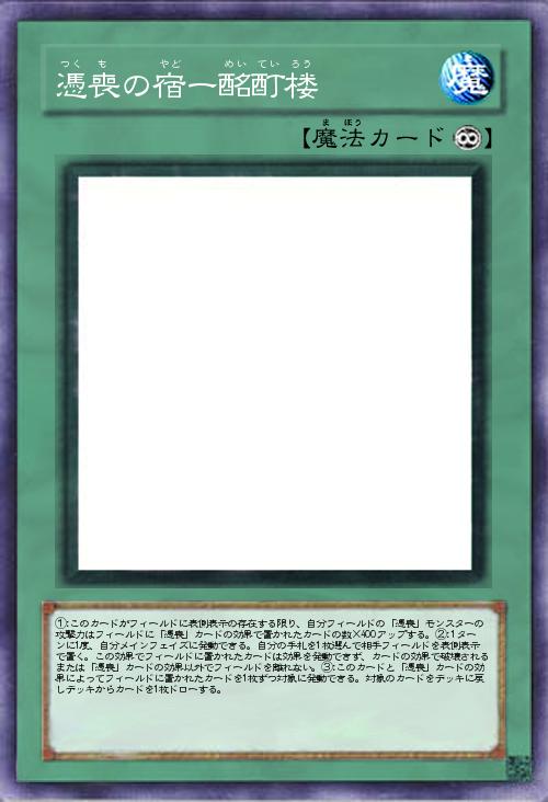 | ①:このカードがフィールドに表側表示の存在する限り、自分フィールドの「憑喪」モンスターの攻撃力はフィールドに「憑喪」カードの効果で置かれたカードの数×400アップする。②:1ターンに1度、自分メインフェイズに発動できる。自分の手札を1枚選んで相手フィールドを表側表示で置く。この効果でフィールドに置かれたカードは効果を発動できず、カードの効果で破壊されるまたは「憑喪」カードの効果以外でフィールドを離れない。③:このカードと「憑喪」カードの効果によってフィールドに置かれたカードを1枚ずつ対象に発動できる。対象のカードをデッキに戻しデッキからカードを1枚ドローする。 | |||