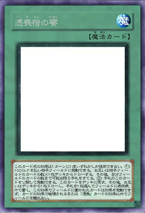 | このカード名の効果は1ターンに1度いずれかしか使用できない。①:1000LPを払い相手フィールドに発動できる。お互いは相手フィールドのカードの数×1枚デッキからドローする。その後、自分フィールドのカードの数まで可能な限り手札をすてる。②:手札のこのカードを公開して発動できる。このカードをデッキに戻す。その後、お互いはデッキから1枚ドローし、手札を1枚選んでフィールドに表側表示で置く。この効果でフィールドに置かれたカードは効果を発動できず、カードの効果で破壊されるまたは「憑喪」カードの効果以外でフィールドを離れない。 | |||