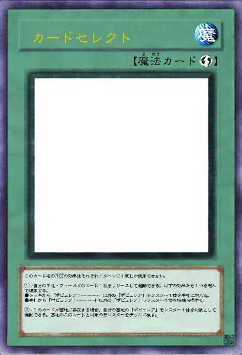 | このカード名の①②の効果はそれぞれ1ターンに1度しか使用できない。 ①:自分の手札・フィールドのカード1枚をリリースして発動できる。以下の効果から1つを選んで適用する。 ●デッキから「ポピュレア:ーーーー」以外の「ポピュレア」モンスター1体を手札に加える。 ●手札から「ポピュレア:ーーーー」以外の「ポピュレア」モンスター1体を特殊召喚する。 ②:このカードが墓地に存在する場合、自分の墓地の「ポピュレア」モンスター1体を対象として発動できる。墓地のこのカードと対象のモンスターをデッキに戻す。 | |||