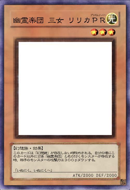 このカードは「幻想郷」が存在しない時除外される。自分の場にこのカード以外に2体「幽霊楽団」と名の付くモンスターが存在する時、相手のモンスターの攻撃力は300pダウンする。 「いぬにく、いぬにく~」 |