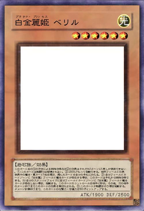 | このカード名の④の方法による特殊召喚及び②の効果はそれぞれ1ターンに1度しか使用できない。①:このカードは戦闘では破壊されない。②:2000LP払って発動できる。相手フィールドの表側表示の魔法・罠カード1枚を選び、選んだカードを自分の手札に加える。③:自分フィールドカードゾーンに「白金麗」フィールド魔法カードが存在する場合、このカードは手札から特殊召喚できる。④:自分のスタンバイフェイズに自分フィールドカードゾーンに「白金麗」フィールド魔法カードが存在しない場合、発動する。このカードのコントロールを相手に移す。その後、次の相手のターン終了までこのカードの効果を無効化される。⑤:このカードが戦闘を行う場合発動する。ダメージ計算終了まで、このカードの攻撃力・守備力を500ポイントアップする。 | |||