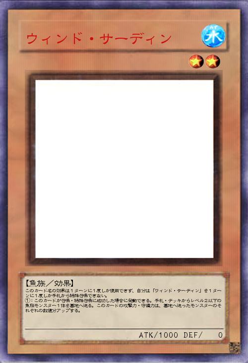 | このカード名の効果は1ターンに1度しか使用できず、自分は「ウィンド・サーディン」を1ターンに1度しか手札から特殊召喚できない。 ①:このカードが召喚・特殊召喚に成功した場合に発動できる。手札・デッキからレベル2以下の魚族モンスター1体を墓地へ送る。このカードの攻撃力・守備力は、墓地へ送ったモンスターのそれぞれの数値分アップする。 | |||