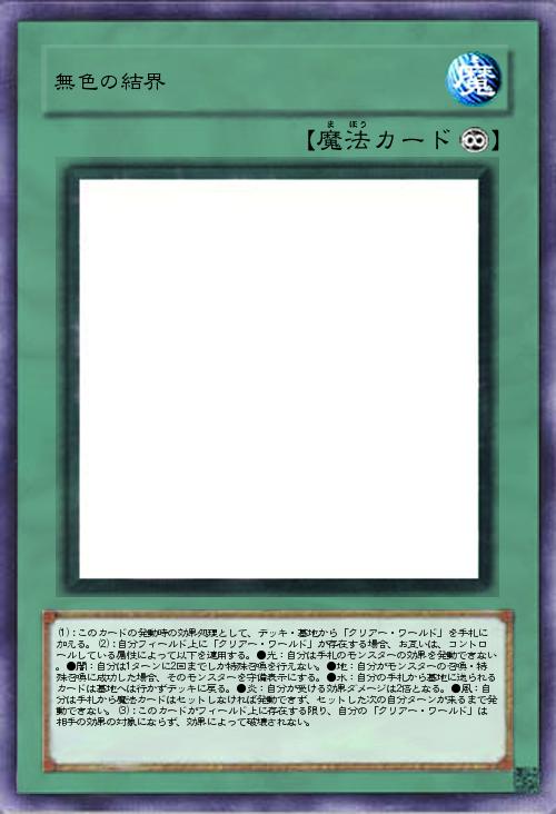 | (1):このカードの発動時の効果処理として、デッキ・墓地から「クリアー・ワールド」を手札に加える。(2):自分フィールド上に「クリアー・ワールド」が存在する場合、お互いは、コントロールしている属性によって以下を適用する。●光:自分は手札のモンスターの効果を発動できない。●闇:自分は1ターンに2回までしか特殊召喚を行えない。●地:自分がモンスターの召喚・特殊召喚に成功した場合、そのモンスターを守備表示にする。●水:自分の手札から墓地に送られるカードは墓地へは行かずデッキに戻る。●炎:自分が受ける効果ダメージは2倍となる。●風:自分は手札から魔法カードはセットしなければ発動できず、セットした次の自分ターンが来るまで発動できない。(3):このカードがフィールド上に存在する限り、自分の「クリアー・ワールド」は相手の効果の対象にならず、効果によって破壊されない。 | |||
