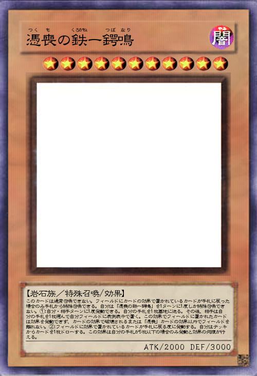 | このカードは通常召喚できない。フィールドにカードの効果で置かれているカードが手札に戻った場合のみ手札から特殊召喚できる。自分は「憑喪の鉄ー鍔鳴」を1ターンに1度しか特殊召喚できない。①:自分・相手ターンに1度発動できる。自分の手札を1枚墓地に送る。その後、相手は自分の手札を1枚選んで自分フィールドに表側表示で置く。この効果でフィールドに置かれたカードは効果を発動できず、カードの効果で破壊されるまたは「憑喪」カードの効果以外でフィールドを離れない。②:フィールドに効果で置かれているカードが手札に戻る度に発動する。自分はデッキからカードを1枚ドローする。この効果は自分の手札が5枚以下の場合のみ発動と効果の処理が行える。 | |||