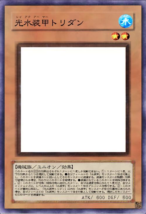 | このカード名の②③の効果はそれぞれ1ターンに1度しか発動できない。①:1ターンに1度、以下の効果から1つを選択して発動できる。●自分フィールドの「水装甲」モンスター1体を対象とし、このカードを装備カード扱いとしてそのモンスターに装備する。装備モンスターが戦闘・効果で破壊される場合、代わりにこのカードを破壊する。●装備されているこのカードを特殊召喚する。②:このカードが召喚・特殊召喚に成功したターン、自分は通常召喚に加えて1度だけ、自分メインフェイズに、レベル5以上の「水装甲」モンスター1体をアドバンス召喚できる。③:このカードが墓地に存在し、「光水装甲トリダン」以外の「水装甲」モンスターが自分の墓地に送られた場合、自分フィールドの「水装甲」モンスター1体を対象として発動できる。選択したモンスターにこのカードを装備する。 | |||