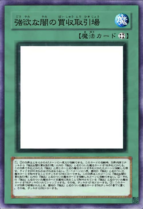 | ①、②の効果はどちらかのみ1ターンに一度だけ発動できる。このカードの発動時、効果処理でデッキから「強欲な闇の買収取引場」以外の「強欲」と名のついた魔法カードを1枚手札に加える。この効果で手札に加えた「強欲」と同じカード名の魔法カードを手札に加えたターンに発動した場合、ライフを2000支払わなければならない。①:1ターンに一度、墓地の「強欲」と名のついた魔法カードを除外することでデッキから1枚ドローできる。この効果はこのターンに「強欲な闇の買収取引場」以外の「強欲」と名のついた魔法カードを発動したターンに発動できない。②:手札の「強欲」と名のついた魔法カードを墓地に送ることで除外されている「強欲」と名のついた魔法カードを1枚デッキの入れてシャッフルする。その後、デッキから1枚ドローする。③:このカードが効果で破壊されたとき、墓地の「強欲」と名のついた魔法カードを5枚デッキの1番下に置く。その | |||