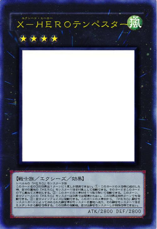 | レベル4の「HERO」モンスター3体 このカード名の③の効果は1ターンに1度しか使用できない。①:このカードのX召喚に成功した時、自分の墓地の「HERO」モンスター1体を対象として発動できる。そのカードをこのカードの下に重ねてX素材とする。②:このカードのX素材を1つ取り除いて発動できる。このターン、自分フィールドの「HERO」モンスターは効果では破壊されない。この効果は相手ターンでも発動できる。③:自分メインフェイズに発動できる。このカードのX素材から、「HERO」融合モンスターカードによって決められた融合素材モンスターを墓地へ送り、その融合モンスター1体をEXデッキから融合召喚する。この効果の発動後、自分は融合モンスターしか特殊召喚できない。 | |||