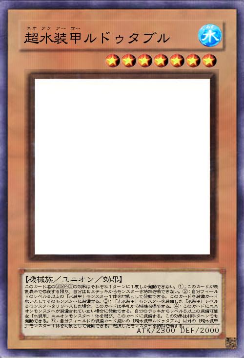 | このカード名の②③④⑤の効果はそれぞれ1ターンに1度しか発動できない。①:このカードが表側表示で存在する限り、自分はEXデッキからモンスターを特殊召喚できない。②:自分フィールドのレベル5以上の「水装甲」モンスター1体を対象として発動できる。このカードを装備カード扱いとしてそのモンスターに装備する。③:「光水装甲」モンスターを装備した「水装甲」レベル5モンスターをリリースした場合、このカードは手札から特殊召喚できる。④:このカードにユニオンモンスターが装備されていない場合に発動できる。自分のデッキからレベル5以上の装備可能な「水装甲」ユニオンモンスター1体を選び、このカードに装備する。この効果は相手ターンでも発動できる。⑤:自分フィールドの装備カード扱いの「超水装甲ルドゥタブル」以外の「超水装甲」モンスター1体を対象として発動できる。選択したモンスターを特殊召喚する。 | |||