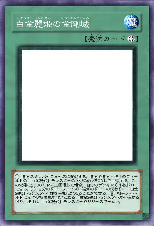 | ①:自分スタンバイフェイズに発動する。自分を自分・相手のフィールドの「白金麗姫」モンスターの種類の数×500LP回復する。この効果で2000LP以上回復した場合、自分のデッキから1枚ドローできる。②:自分のドローフェイズに通常のドローの代わりに「白金麗姫」モンスター1体を手札に加えることができる。③:相手フィールドに元々の持ち主が自分となる「白金麗姫」モンスターが存在する限り、相手は「白金麗姫」モンスターをリリースできない。 | |||