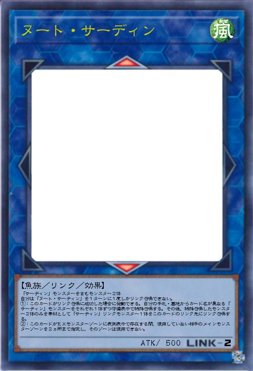 | 「サーディン」モンスターを含むモンスター2体 自分は「ヌート・サーディン」を1ターンに1度しかリンク召喚できない。 ①:このカードがリンク召喚に成功した場合に発動できる。自分の手札・墓地からカード名が異なる「サーディン」モンスターをそれぞれ1体ずつ守備表示で特殊召喚する。その後、特殊召喚したモンスター2体のみを素材として「サーディン」リンクモンスター1体をこのカードのリンク先にリンク召喚する。 ②:このカードがEXモンスターゾーンに表側表示で存在する間、使用していない相手のメインモンスターゾーンを2ヵ所まで指定し、そのゾーンは使用できない。 | |||
