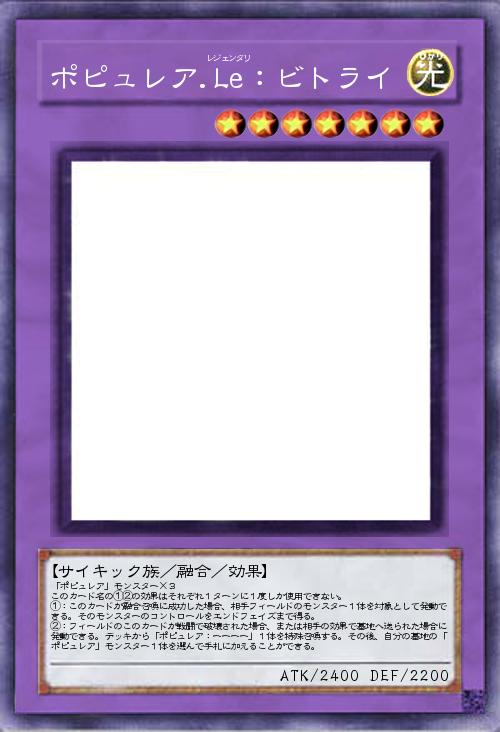 | 「ポピュレア」モンスター×3 このカード名の①②の効果はそれぞれ1ターンに1度しか使用できない。 ①:このカードが融合召喚に成功した場合、相手フィールドのモンスター1体を対象として発動できる。そのモンスターのコントロールをエンドフェイズまで得る。 ②:フィールドのこのカードが戦闘で破壊された場合、または相手の効果で墓地へ送られた場合に発動できる。デッキから「ポピュレア:ーーーー」1体を特殊召喚する。その後、自分の墓地の「ポピュレア」モンスター1体を選んで手札に加えることができる。 | |||