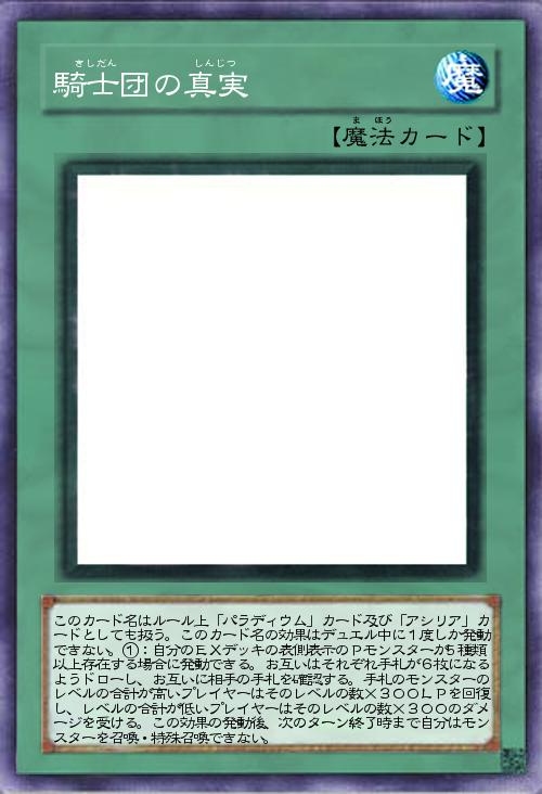 | このカード名はルール上「パラディウム」カード及び「アシリア」カードとしても扱う。このカード名の効果はデュエル中に1度しか発動できない。①:自分のEXデッキの表側表示のPモンスターが5種類以上存在する場合に発動できる。お互いはそれぞれ手札が6枚になるようドローし、お互いに相手の手札を確認する。手札のモンスターのレベルの合計が高いプレイヤーはそのレベルの数×300LPを回復し、レベルの合計が低いプレイヤーはそのレベルの数×300のダメージを受ける。この効果の発動後、次のターン終了時まで自分はモンスターを召喚・特殊召喚できない。 | |||