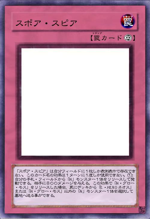 | 「スポア・スピア」は自分フィールドに1枚しか表側表示で存在できない。このカード名の効果は1ターンに1度しか使用できない。①:自分の手札・フィールドから「N」モンスター1体をリリースして発動できる。相手に800ダメージを与える。この効果で「N・グロー・モス」をリリースした場合、更にデッキから「E・HEROネオス」または「N・グロー・モス」以外の「N」モンスター1体を選択して墓地へ送る事ができる。 | |||