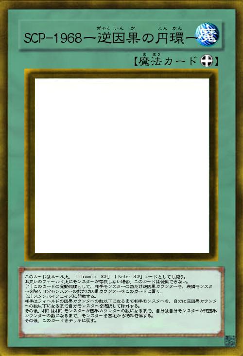 | このカードはルール上、「 Thaumiel SCP」「 Keter SCP」カードとしても扱う。 お互いのフィールド上にモンスターが存在しない場合、このカードは発動できない。 (1)このカードの発動処理として、相手モンスターの数だけ逆因果カウンターを、装備モンスターを除く自分モンスターの数だけ因果カウンターをこのカードに置く。 (2)スタンバイフェイズに発動する。 相手はフィールドの因果カウンターの数以下になるまで相手モンスターを、自分は逆因果カウンターの数以下になるまで自分モンスターを選択して除外する。 その後、相手は相手モンスターが因果カウンターの数になるまで、自分は自分モンスターが逆因果カウンターの数になるまで、モンスターを墓地から特殊召喚する。 その後、このカードをデッキに戻す。 | |||