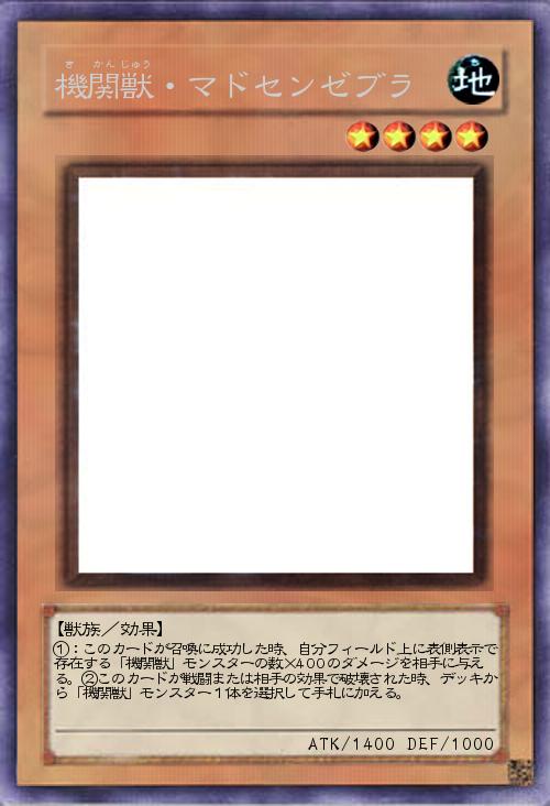 | ①:このカードが召喚に成功した時、自分フィールド上に表側表示で存在する「機関獣」モンスターの数×400のダメージを相手に与える。②このカードが戦闘または相手の効果で破壊された時、デッキから「機関獣」モンスター1体を選択して手札に加える。 | |||