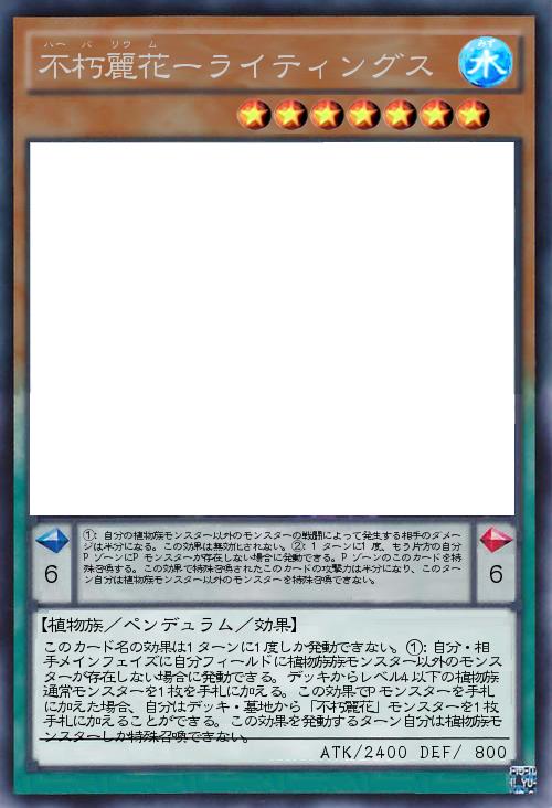 | このカード名の効果は1ターンに1度しか発動できない。①:自分・相手メインフェイズに自分フィールドに植物族族モンスター以外のモンスターが存在しない場合に発動できる。デッキからレベル4以下の植物族通常モンスターを1枚を手札に加える。この効果でPモンスターを手札に加えた場合、自分はデッキ・墓地から「不朽麗花」モンスターを1枚手札に加えることができる。この効果を発動するターン自分は植物族モンスターしか特殊召喚できない。 | |||