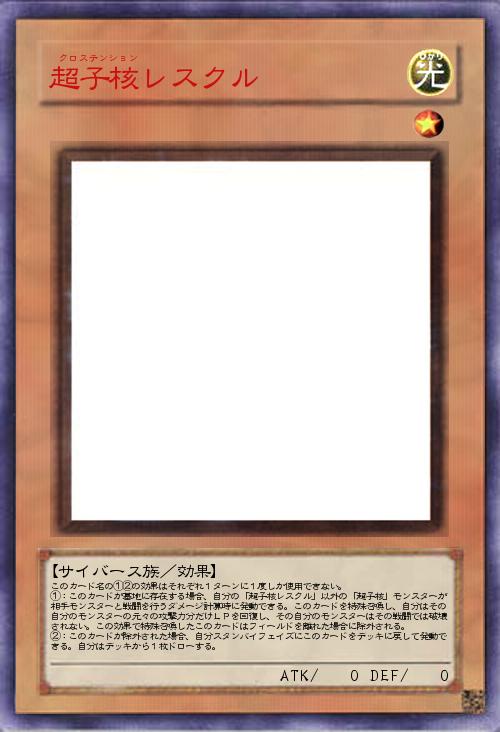 | このカード名の①②の効果はそれぞれ1ターンに1度しか使用できない。 ①:このカードが墓地に存在する場合、自分の「超子核レスクル」以外の「超子核」モンスターが相手モンスターと戦闘を行うダメージ計算時に発動できる。このカードを特殊召喚し、自分はその自分のモンスターの元々の攻撃力分だけLPを回復し、その自分のモンスターはその戦闘では破壊されない。この効果で特殊召喚したこのカードはフィールドを離れた場合に除外される。 ②:このカードが除外された場合、自分スタンバイフェイズにこのカードをデッキに戻して発動できる。自分はデッキから1枚ドローする。 | |||