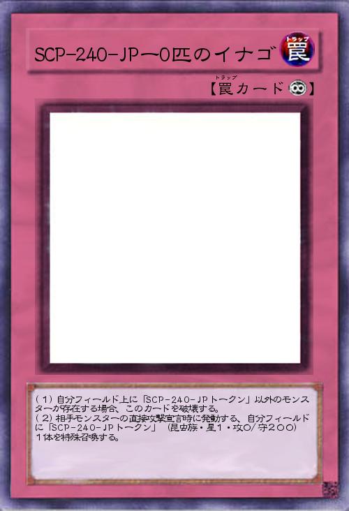 | (1)自分フィールド上に「SCP-240-JPトークン」以外のモンスターが存在する場合、このカードを破壊する。 (2)相手モンスターの直接攻撃宣言時に発動する、自分フィールドに「SCP-240-JPトークン」(昆虫族・星1・攻0/守200) 1体を特殊召喚する。 | |||