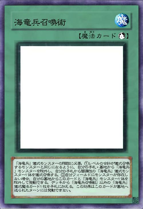 | 「海竜兵」儀式モンスターの降臨に必要。①レベルの合計が儀式召喚するモンスターと同じになるように、自分の手札・墓地から「海竜兵」モンスターを除外し、自分の手札から闇属性の「海竜兵」儀式モンスター1体を儀式召喚する。②自分フィールドにモンスターが存在しない場合、自分の墓地からこのカードと「海竜兵」モンスター1体を除外して発動できる。デッキから「海竜兵召喚獣」以外の「海竜兵」儀式魔法カード1枚を手札に加える。この効果はこのカードが墓地へ送られたターンには発動できない。 | |||