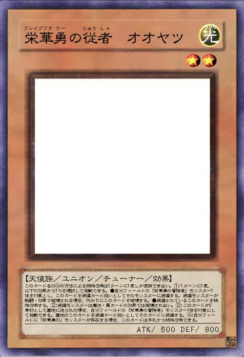 | このカード名の④の方法による特殊召喚は1ターンに1度しか使用できない。①:1ターンに1度、以下の効果から1つを選択して発動できる。●自分フィールドの「栄華勇の冒険者」モンスター1体を対象とし、このカードを装備カード扱いとしてそのモンスターに装備する。装備モンスターが戦闘・効果で破壊される場合、代わりにこのカードを破壊する。●装備されているこのカードを特殊召喚する。②:装備モンスターは魔法・罠カードの効果では破壊されない。③:このカードがS素材として墓地に送られた場合、自分フィールドの「栄華勇の冒険者」モンスター1体を対象にして発動できる。墓地のこのカードを装備カード扱いとしてそのカードに装備する。④:自分フィールドに「栄華勇の」モンスターが存在する場合、このカードは手札から特殊召喚できる。 | |||
