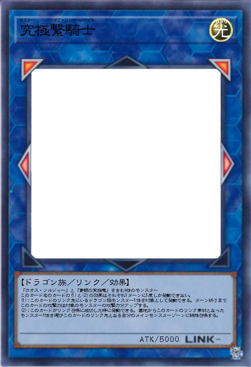 | 「カオス・ソルジャー」と「青眼の究極竜」を含む4体のモンスター このカード名のカードの(1)と(2)の効果はそれぞれ1ターンに1度しか発動できない。 (1):このカードのリンク先にいるドラゴン族モンスター1体を対象として発動できる。ターン終了までこのカードの攻撃力は対象のモンスターの攻撃力分アップする。 (2):このカードがリンク召喚に成功した時に発動できる。墓地からこのカードのリンク素材となったモンスター1体を選びこのカードのリンク先となる自分のメインモンスターゾーンに特殊召喚する。 | |||