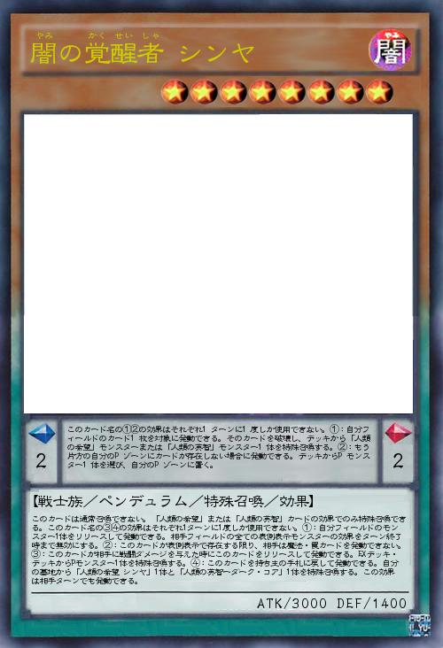 | このカードは通常召喚できない。「人類の希望」または「人類の英智」カードの効果でのみ特殊召喚できる。このカード名の③④の効果はそれぞれ1ターンに1度しか使用できない。①:自分フィールドのモンスター1体をリリースして発動できる。相手フィールドの全ての表側表示モンスターの効果をターン終了時まで無効にする。②:このカードが表側表示で存在する限り、相手は魔法・罠カードを発動できない。③:このカードが相手に戦闘ダメージを与えた時にこのカードをリリースして発動できる。EXデッキ・デッキからPモンスター1体を特殊召喚する。④:このカードを持ち主の手札に戻して発動できる。自分の墓地から「人類の希望 シンヤ」1体と「人類の英智ーダーク・コア」1体を特殊召喚する。この効果は相手ターンでも発動できる。 | |||