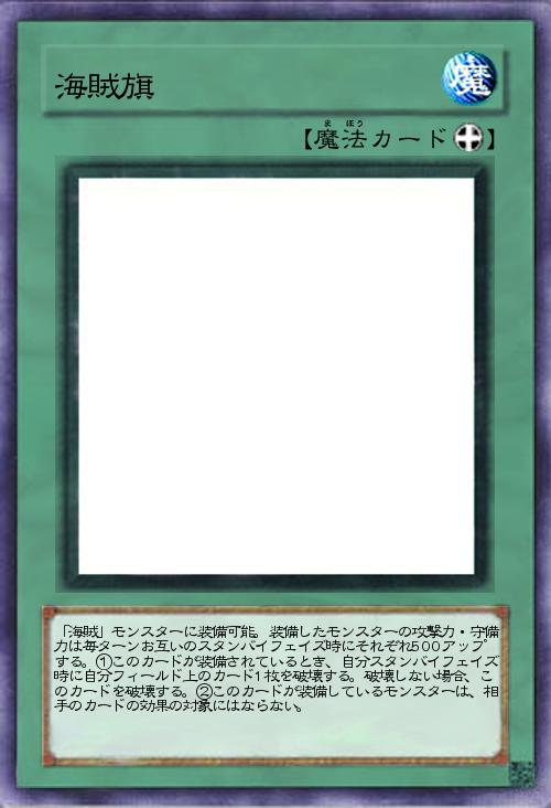 | 「海賊」モンスターに装備可能。装備したモンスターの攻撃力・守備力は毎ターンお互いのスタンバイフェイズ時にそれぞれ500アップする。①このカードが装備されているとき、自分スタンバイフェイズ時に自分フィールド上のカード1枚を破壊する。破壊しない場合、このカードを破壊する。②このカードが装備しているモンスターは、相手のカードの効果の対象にはならない。 | |||