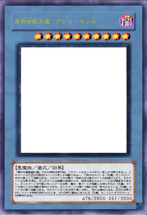 | 「最終王魔降臨の儀」でのみ特殊召喚可能。このカードはデュエル中に一度しか召喚できない。このカードの①③の効果は1ターンに1度しか発動できない。①除外されている「王魔」モンスター1枚を対象として発動できる。このカードの攻撃力・防御力は対象のカードの数値分上がり、そのカードの効果を得る。②このカードは戦闘で破壊されず、特殊召喚されたターンには攻撃宣言できない。③このカードを対象にモンスターの効果・魔法・罠カードが発動した時に手札の「王魔」カードを捨ててその発動を無効にできる。④このカードが場から離れた時、除外されている「王魔」カードを対象に発動できる。そのカードをできる限り場に召喚し、残りは墓地に送る。⑤④の効果でXモンスターが特殊召喚されたとき、その効果で墓地に送られる「王魔」モンスターをそのカードのX素材にする。 | |||