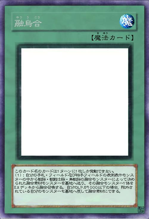 | このカード名のカードは1ターンに1枚しか発動できない。 (1):自分の手札・フィールド及び相手フィールドの表側表示モンスターの中から獣族・獣戦士族・鳥獣族の融合モンスターによって決められた融合素材モンスターを墓地へ送り、その融合モンスター1体をEXデッキから融合召喚する。自分のLPが1000以下の場合、除外されている自分のモンスターも墓地へ戻して融合素材にできる。 | |||