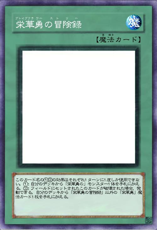 | このカード名の①②の効果はそれぞれ1ターンに1度しか使用できない。①:自分のデッキから「栄華勇の」モンスター1体を手札に加える。②:フィールドにセットされたこのカードが破壊された場合、発動できる。自分のデッキから「栄華勇の冒険録」以外の「栄華勇」魔法カード1枚を手札に加える。 | |||