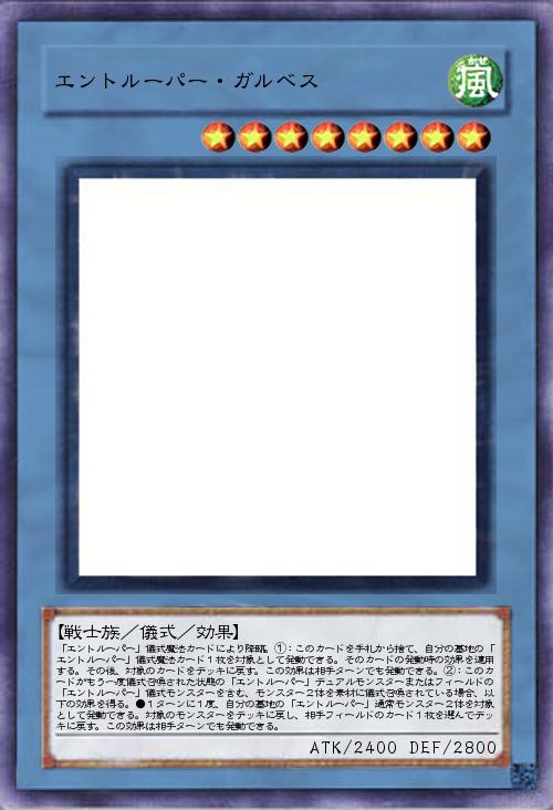 | 「エントルーパー」儀式魔法カードにより降臨。①:このカードを手札から捨て、自分の墓地の「エントルーパー」儀式魔法カード1枚を対象として発動できる。そのカードの発動時の効果を適用する。その後、対象のカードをデッキに戻す。この効果は相手ターンでも発動できる。②:このカードがもう一度儀式召喚された状態の「エントルーパー」デュアルモンスターまたはフィールドの「エントルーパー」儀式モンスターを含む、モンスター2体を素材に儀式召喚されている場合、以下の効果を得る。●1ターンに1度、自分の墓地の「エントルーパー」通常モンスター2体を対象として発動できる。対象のモンスターをデッキに戻し、相手フィールドのカード1枚を選んでデッキに戻す。この効果は相手ターンでも発動できる。 | |||