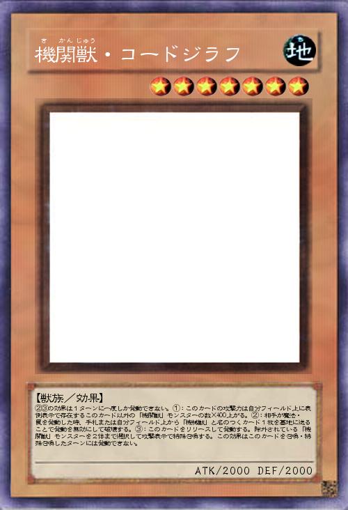 | ②③の効果は1ターンに一度しか発動できない。①:このカードの攻撃力は自分フィールド上に表側表示で存在するこのカード以外の「機関獣」モンスターの数×400上がる。②:相手が魔法・罠を発動した時、手札または自分フィールド上から「機械獣」と名のつくカード1枚を墓地に送ることで発動を無効にして破壊する。③:このカードをリリースして発動する。除外されている「機関獣」モンスターを2体まで選択して攻撃表示で特殊召喚する。この効果はこのカードを召喚・特殊召喚したターンには発動できない。 | |||