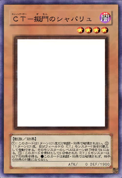 | ①:このカードは1ターンに1度だけ戦闘・効果で破壊されない。②:1ターンに1度、自分フィールドの「CT」モンスター1体を対象として発動できる。そのモンスターのレベルはターン終了時まで4になる。③:このカードを素材としてS召喚された「CT」Sモンスターは以下の効果を得る。●このカードは戦闘・効果では破壊されず、相手の効果の対象にならない。 | |||