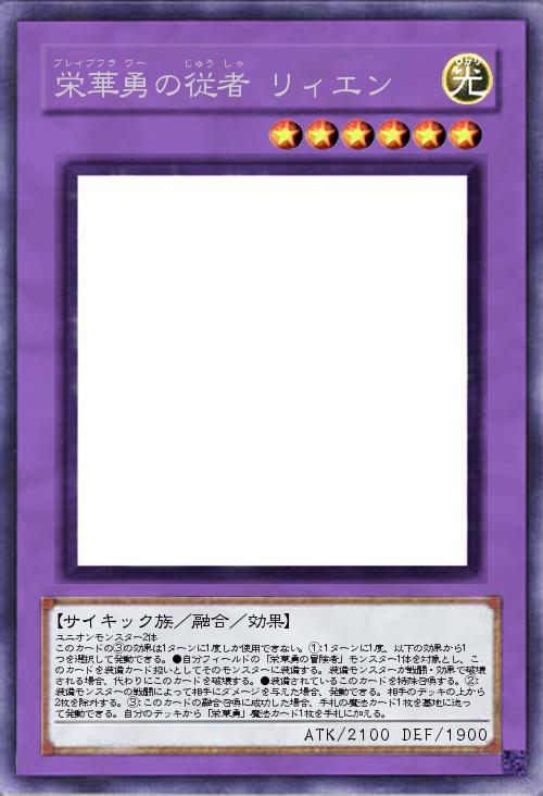 | ユニオンモンスター2体 このカードの③の効果は1ターンに1度しか使用できない。①:1ターンに1度、以下の効果から1つを選択して発動できる。●自分フィールドの「栄華勇の冒険者」モンスター1体を対象とし、このカードを装備カード扱いとしてそのモンスターに装備する。装備モンスターが戦闘・効果で破壊される場合、代わりにこのカードを破壊する。●装備されているこのカードを特殊召喚する。②:装備モンスターの戦闘によって相手にダメージを与えた場合、発動できる。相手のデッキの上から2枚を除外する。③:このカードの融合召喚に成功した場合、手札の魔法カード1枚を墓地に送って発動できる。自分のデッキから「栄華勇」魔法カード1枚を手札に加える。 | |||
